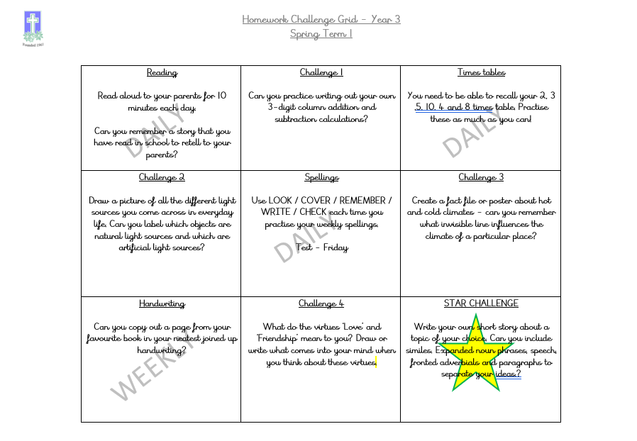 The homework grid has been sent home which has a number of different challenges for this half term. There is a copy below for anyone who has misplaced it.